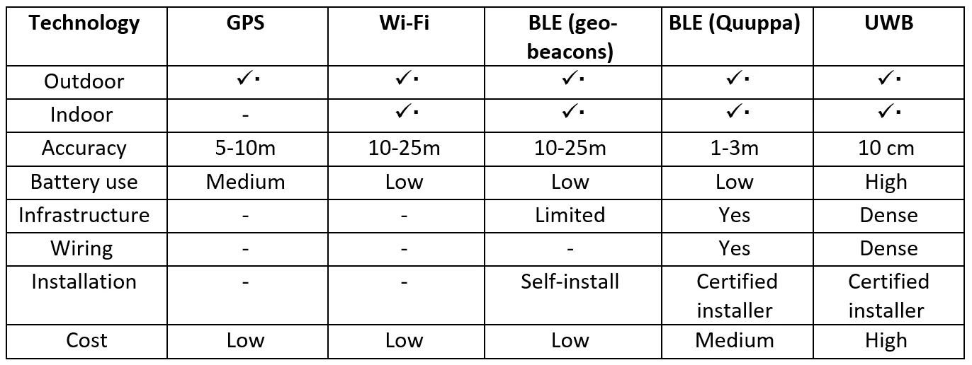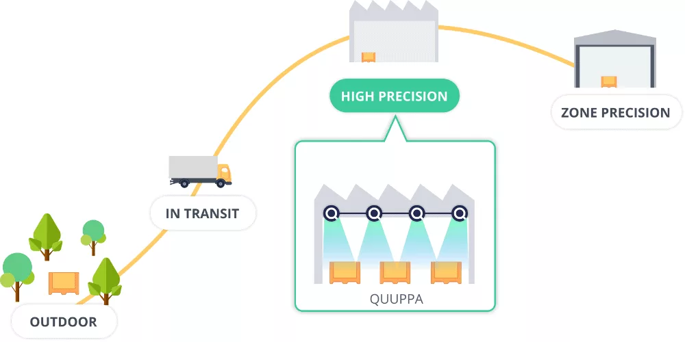 Si le positionnement extérieur est possible en utilisant uniquement les traceurs, pour obtenir des connaissances plus approfondies sur le comportement de leurs biens à l’intérieur de leurs propres locaux, les clients se tournent vers les balises Bluetooth et le reniflage Wi-Fi, qui permettent d’obtenir une précision de position de 10 à 25 mètres. Ce sont des solutions intérieures abordables, mais en raison de leurs processus de production intensifs, certaines entreprises ont besoin d’atteindre une précision de localisation d’environ 1 mètre.